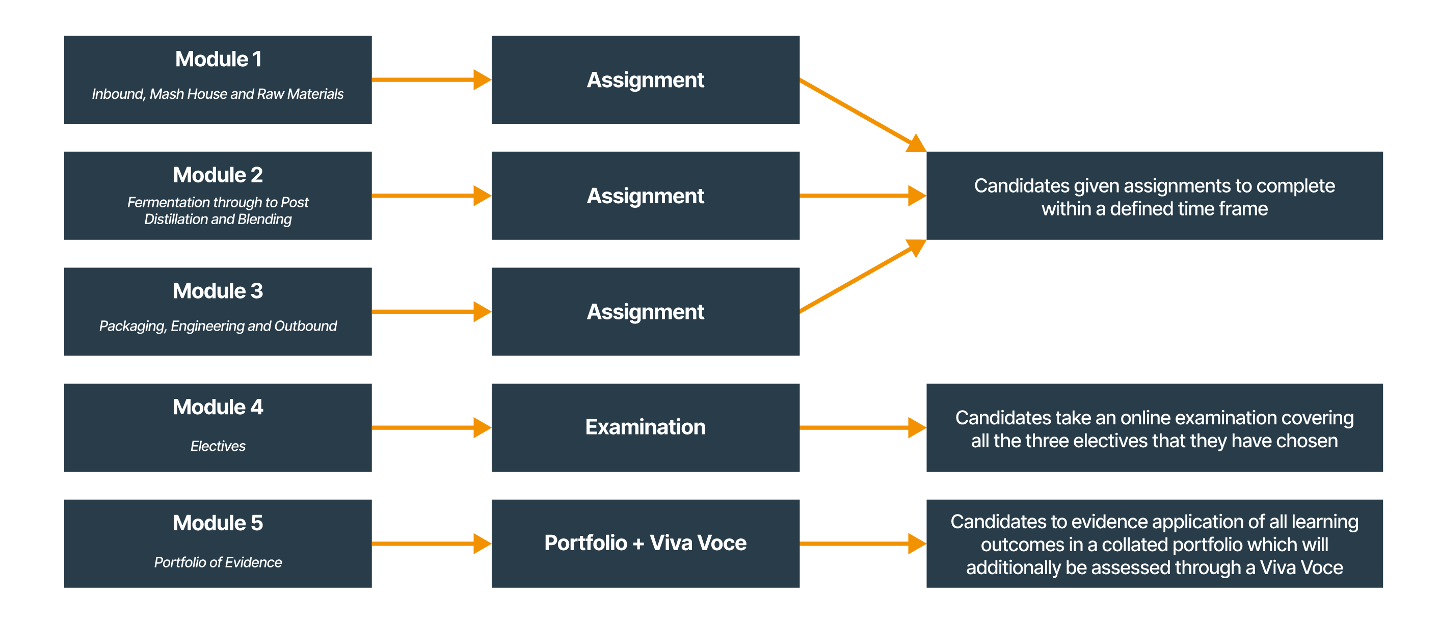 There are five Modules in total. Modules 1, 2 and 3 cover the full end to end value chain that encompasses distilling – they can be done in any order, but all must be completed before starting Module 4.